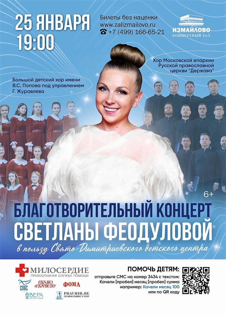 25 января 2022 года в 19:00, состоится благотворительный концерт оперной певицы Светланы Феодуловой в Концертном зале «Измайлово», средства от которого будут направлены в помощь подопечным Свято-Димитриевского детского центра. Это один из первых проектов Правсолавной службы помощи «Милосердие», который помогает семьям с малолетними детьми, оказавшимися в трудной жизненной ситуации, а также многодетным семьям и воспитывающим детей-инвалидов.