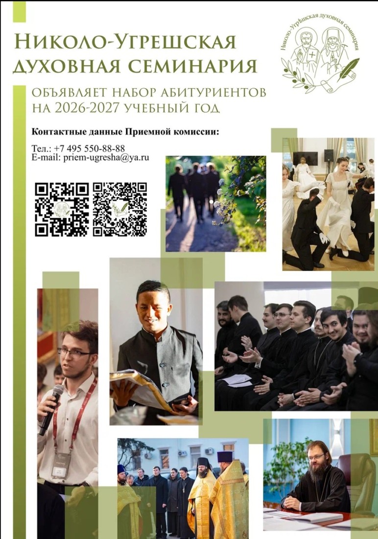 НИКОЛО-УТРЕШСКАЯ ДУХОВНАЯ СЕМИНАРИЯ Опубликовано svmvladimir в 13.12.2025 | Оставить комментарий ОБЪЯВЛЯЕТ НАБОР АБИТУРИЕНТОВ НА 2026-2027 УЧЕБНЫЙ ГОД Контактные данные Приемной комиссии: Тел.: +7 495 550-88-88 E-mail: priem-ugresha@ya.ru Поделиться:Click to share on Telegram (Opens in new window)Отправить ссылку в ВКонтакте (Opens in new window)Отправить ссылку в Одноклассники (Opens in new window)Click to share on Pinterest (Opens in new window)Поделитесь в Twitter (Opens in new window)Click to share on Google+ (Opens in new window)Отправить ссылку в Мой Мир (Opens in new window)Нажмите, чтобы распечатать (Opens in new window)Отправьте другу на e-mail (Opens in new window)
