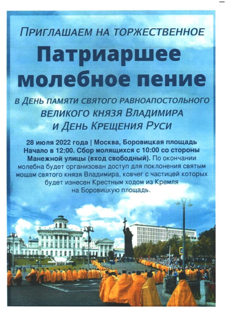 Патриаршее молебное пение состоится в День памяти святого равноапостольного великого князя Владимира и в День Крещения Руси 28 июля 2022 года на Боровицкой площади. Начало в 12:00.