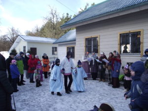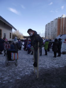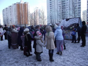 В программе прозвучали веселые задорные русские народные песни, а под протяжный духовный стих «Дороженька Господняя», напоминающий о грядущем Великом посте, была показана небольшая сценка. Вместе с нарядной Масленицей дети и взрослые с большим удовольствием играли в народные хороводные игры – «Заинька», «Челнок», «Тетера». И, конечно же, перетягивали канат. Особым спросом пользовались ходули – каждому хотелось попробовать пошагать на настоящих ходулях, а также шуточные бои с подушками. Провожали Масленицу дружным хороводом.