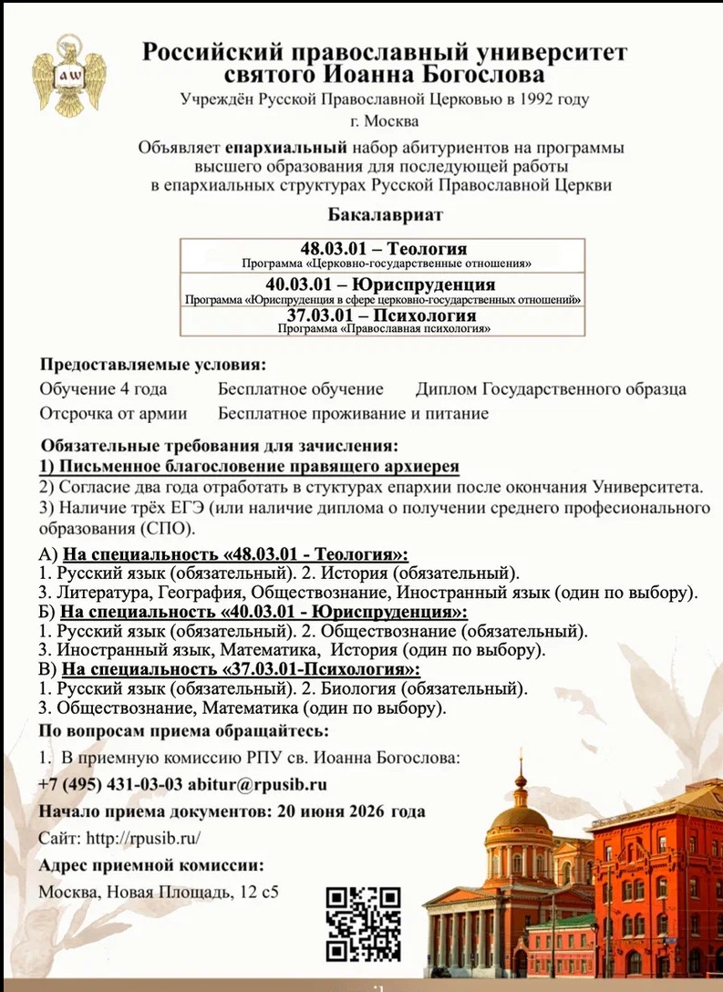 Объявляет епархиальный набор абитуриентов на программы высшего образования для последующей работы в епархиальных структурах Русской Православной Церкви